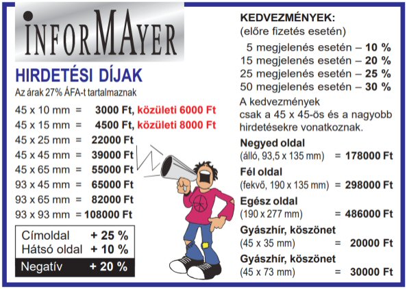 Az "Informayer Reklám és Kereskedelmi Hetilap" Mohács meghatározó információs és hirdető újsága. Lakossági, közületi és vállalkozások hirdetései igény szerint. Lapunk megjelenik hetente Nohácson és és a környező településeken nyomtatott formában, illetve már keddi napokon az esti óráktól elérhető interneten. Informayer az interneten |